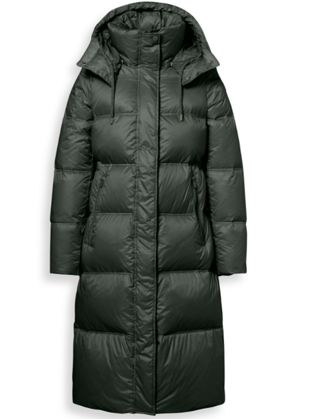 Lång och härlig dunkappa att svepa in sig i när kylan kommer. Dragkedjan är av kraftig tvävägsmodell och döljs bakom tryckknappar. På framsidan finns två snedställda fickor med dragkedja. Ärmarna har en smalare mudd för att håla snålblåsten ute och den stora huvan är avtagbar och har en dragsko för att hållas på plats.