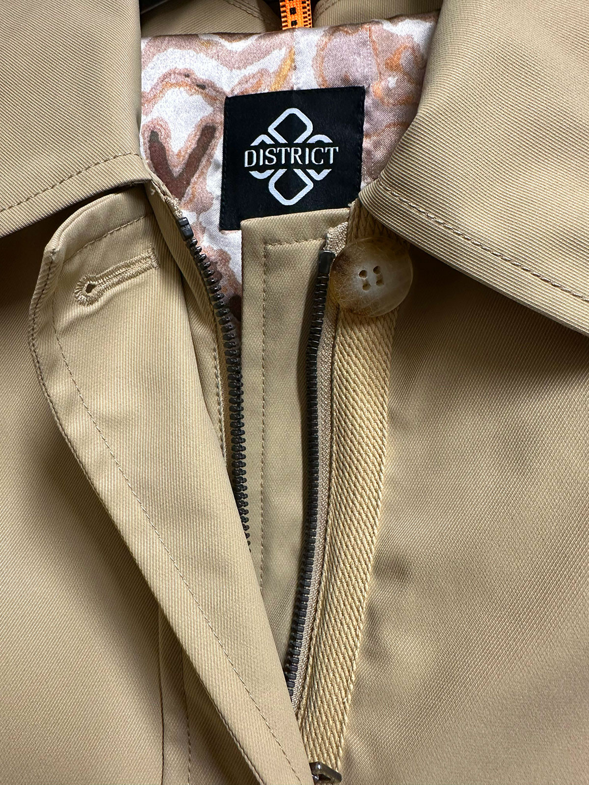 En elegant "trenchjacka" från District. Modellen har fina detaljer såsom kantband runt dragkedja och fickor, samt i nederkanten av ärmen. Jackan stängsmed dragkedja som är dold bakom knäppning. Två snedställda fickor fram som stängs med knapp samt en innerficka. Modellen är både snygg och sportig och tyget är vädertåligt. Fodrad.