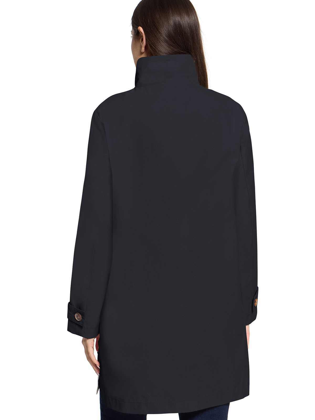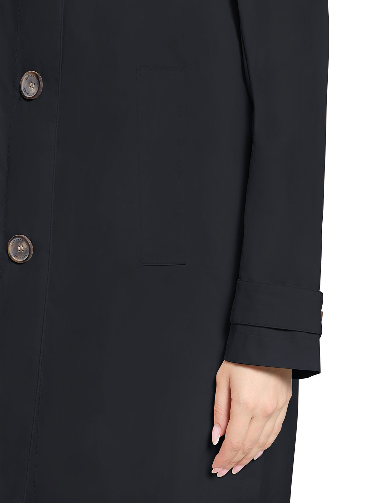 En medellång trenchkappa från Betty Barclay i ett vädertåligt tyg. Modellen är lätt A-linjeformad och har skorstenskrage. Ärmen har slejfdetlj och på framsidan finns två snedställda fickor. Delvis fodrad. Korta slitsar i sidorna.